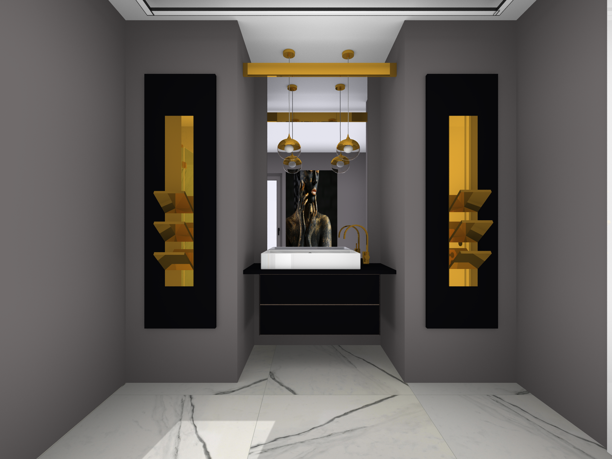 Bei dieser Badvariante haben wir dein Bad rund um dein wunderschönes Bild geplant. Das elegante Farbspiel in Schwarz-Gold sollte sich im gesamten Raum widerspiegeln.